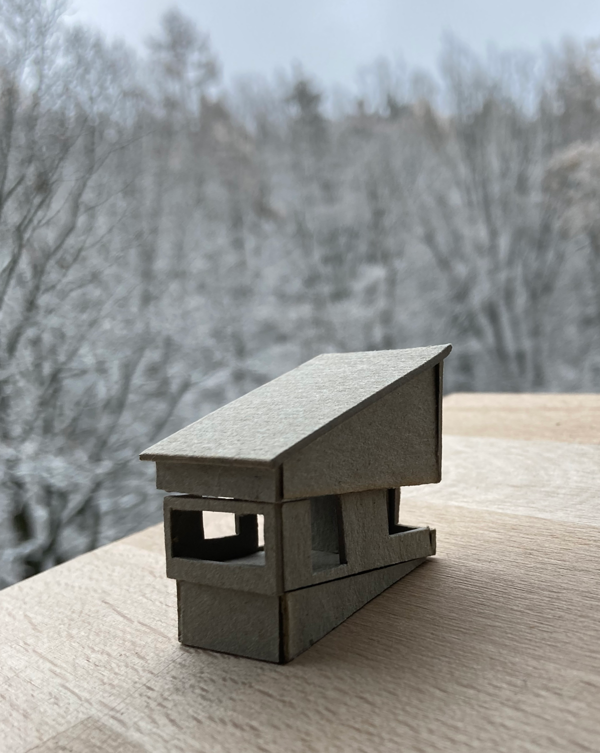 Chatička se střechou ve sklonu svahu do kterého je položena a šindelovou fasádou.
