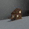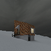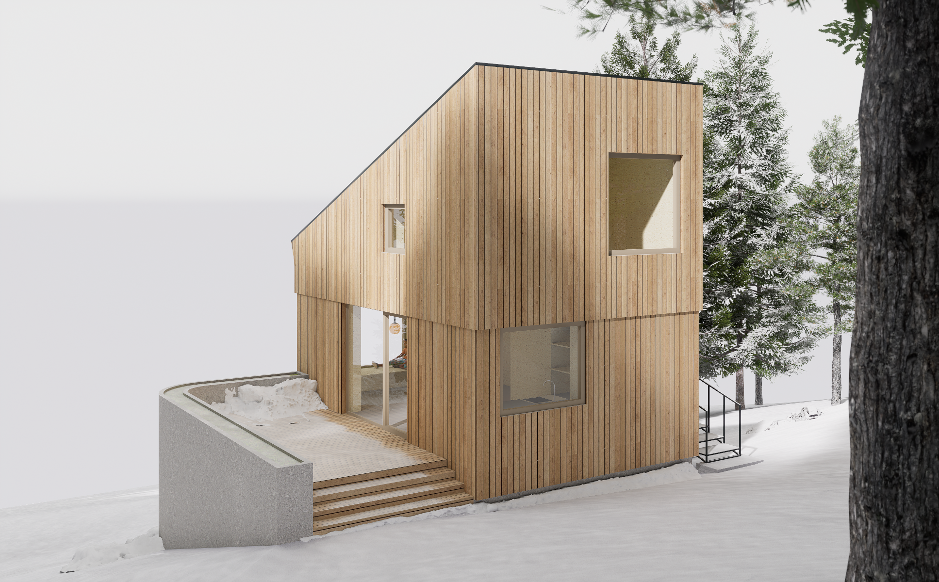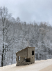 Chatička se střechou ve sklonu svahu do kterého je položena a šindelovou fasádou.