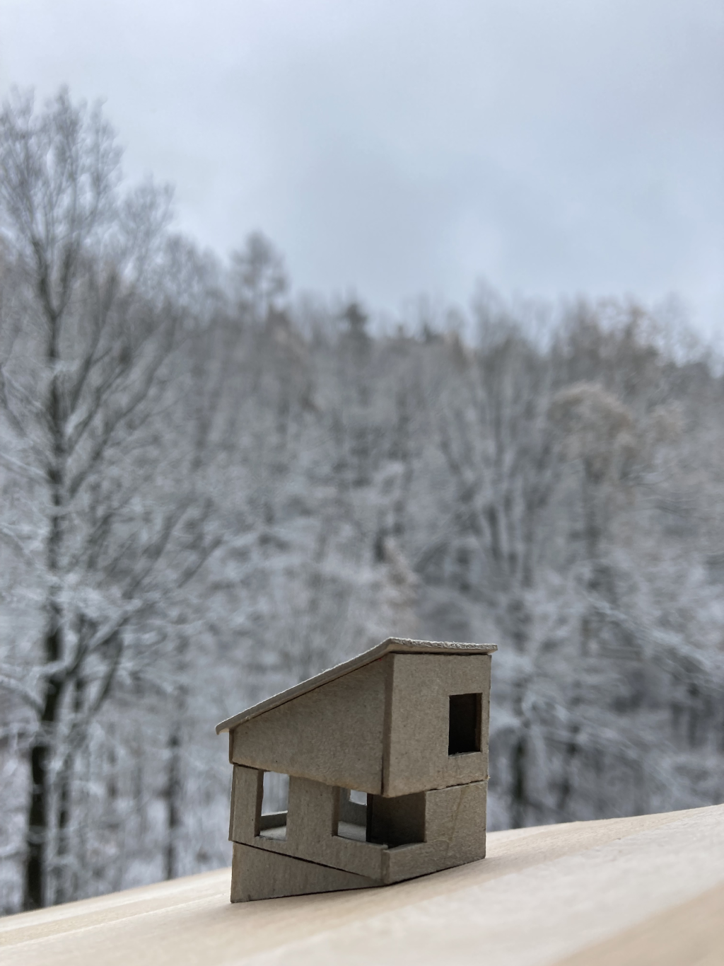 Chatička se střechou ve sklonu svahu do kterého je položena a šindelovou fasádou.