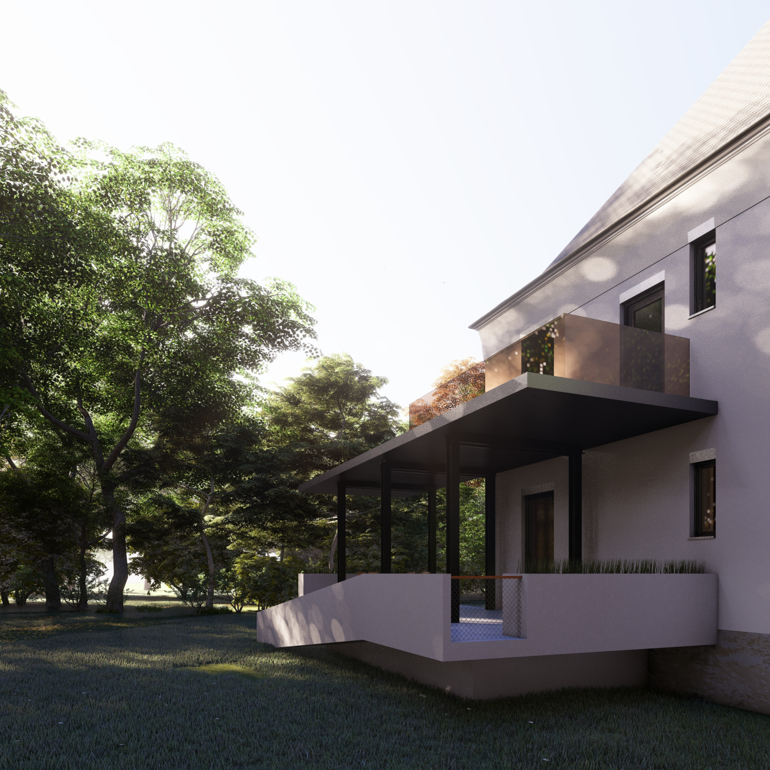 Fine steel construction bears a balcony of second floor apartment and gives a pleasant shade to the terrace of the first floor apartment undreneath. Simmilar construction approach was chosen for the new entrance into the house, together it is a contrasting modern addition to a first republic house.
