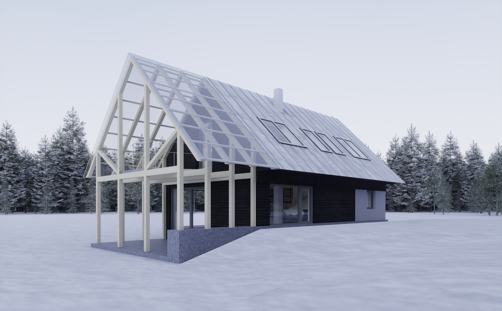 Protože je dům prostorově úsporný rozhodli jsme se prodloužit profil domu o krytou vzdušnou terasu v jejíž blízkosti v budoucnu vznikne koupací jezírko.