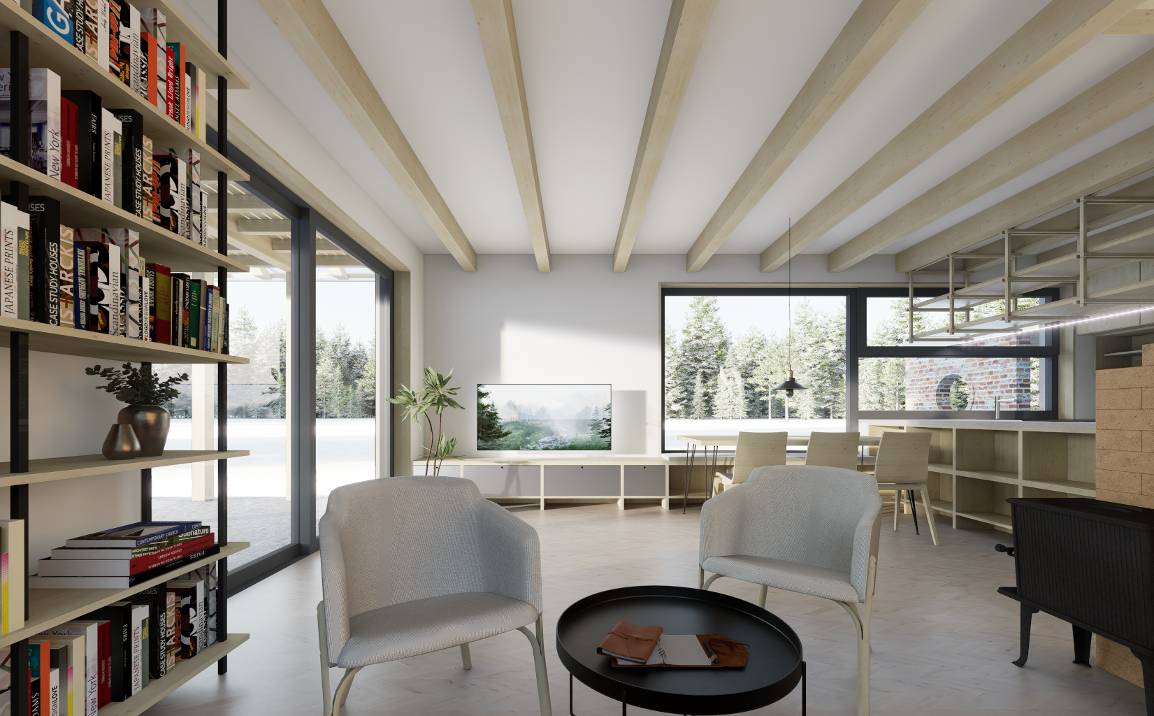 Protože je dům prostorově úsporný rozhodli jsme se prodloužit profil domu o krytou vzdušnou terasu v jejíž blízkosti v budoucnu vznikne koupací jezírko.